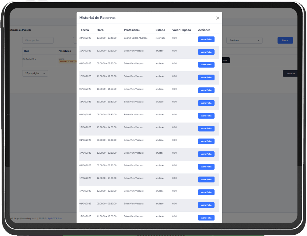 Con ByG-Reservas cada cliente o paciente tiene una ficha única donde se registra su historial de visitas, pagos, servicios realizados, notas y cualquier información relevante para su atención. Esta herramienta es especialmente útil para negocios de salud, bienestar, estética o cualquier rubro donde la personalización marque la diferencia. Toda la información se mantiene protegida y accesible solo para quienes tengan los permisos adecuados.